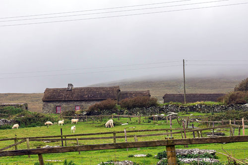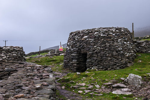 Auf der Halbinsel angekommen nieselte es auch nur noch und wir konnten die Schönheiten auf dem Slea Head Drive genießen und ein paar Stopps einlegen. Unter anderem haben wir uns Steinhäuser und sogenannte Bienenkorbhütten angesehen. Die haben mit Bienen nix zu tun. Der Name leitet sich von der Form ab, in der die Hütten irgendwann lange vor Christus gebaut wurden.