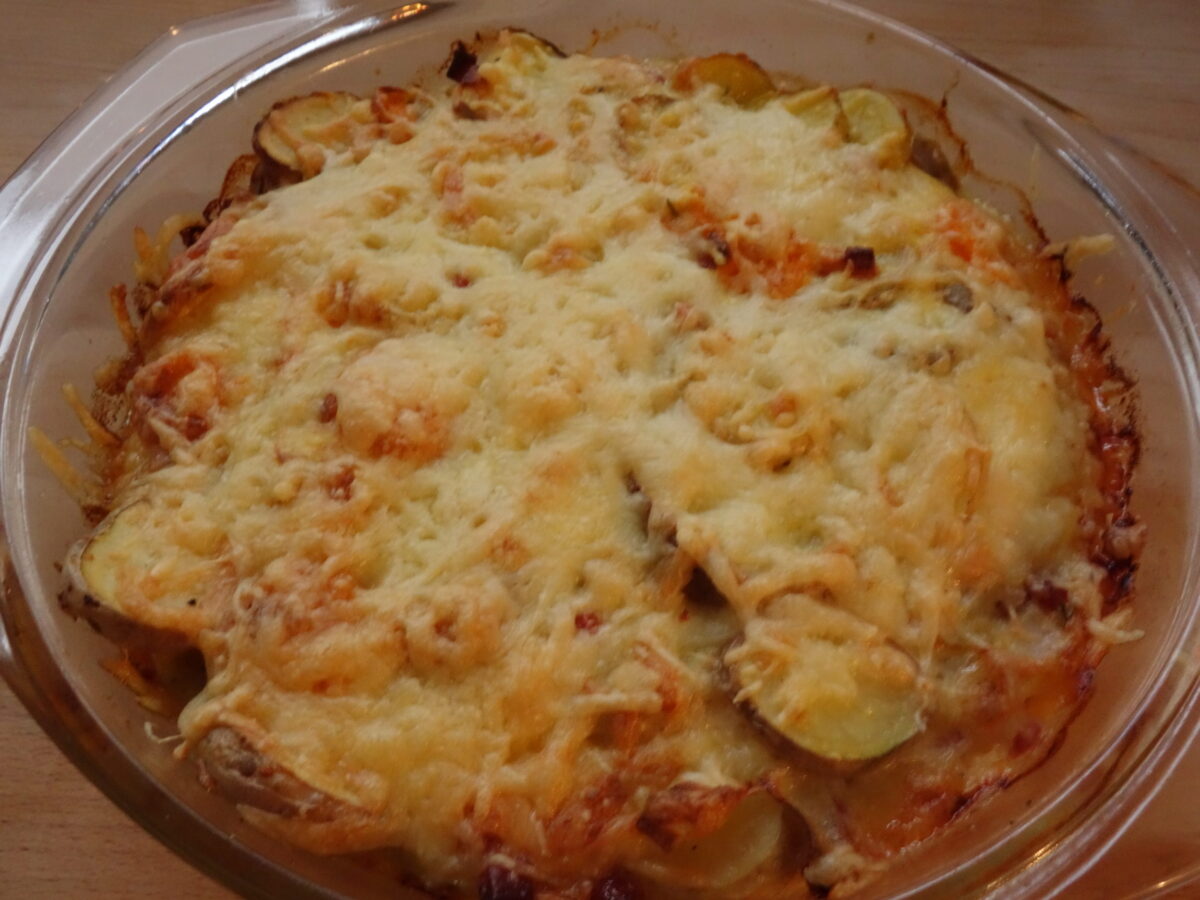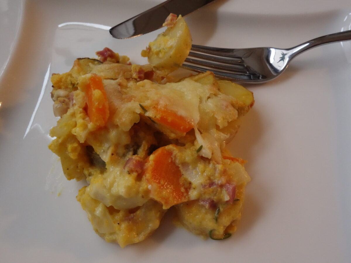 Wir sind uns sicher, das gab es nicht zum letzten Mal. Wie am Anfang schon angedeutet, habe ich zwei Hälften gemacht. Die eine nur mit Kartoffeln, die andere mit Möhre und Kürbis. Beides hat uns sehr gut geschmeckt und so wissen wir, für die kürbisfreie Zeit haben wir einen leckeren Auflauf, der mit wenigen Zutaten auskommt und trotzdem herzerwärmend lecker ist. 🙂